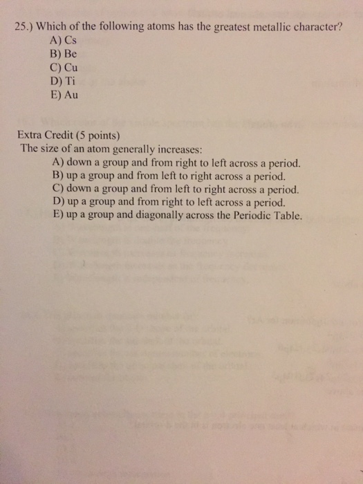 Which of the following atoms has the greatest metallic character. According to the periodic table metallic character increases down the group and decreases across the period. Chemistry questions and answers.